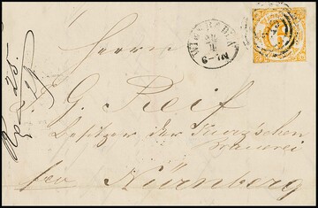 9 Kr. gelborange, Type II, breitrandiges Kabinettstück auf gef. Brief von Wiesbaden nach Nürnberg. Fotoexp. Gärtner "In dieser Erhaltung auf Brief ein seltenes Stück der schwierigen Marke"