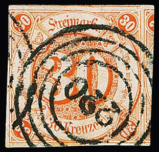 30 Kr. orange, allseits voll-, meist weit überrandig, rechts kl. Spalt zugezogen, mit NS "220" (Frankfurt), Fotoexp. Sem