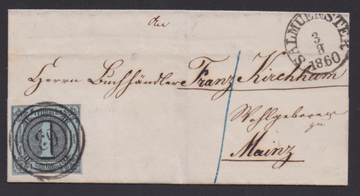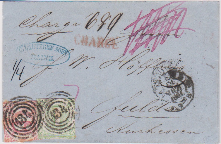 "134" nebst K2 "Mainz" auf Chargébrief mit 1 Kr. grün und 6 Kr. rot (etwas fleckig bzw. Schnittmgl.) nach Fulda, 3. Entfernungsstufe