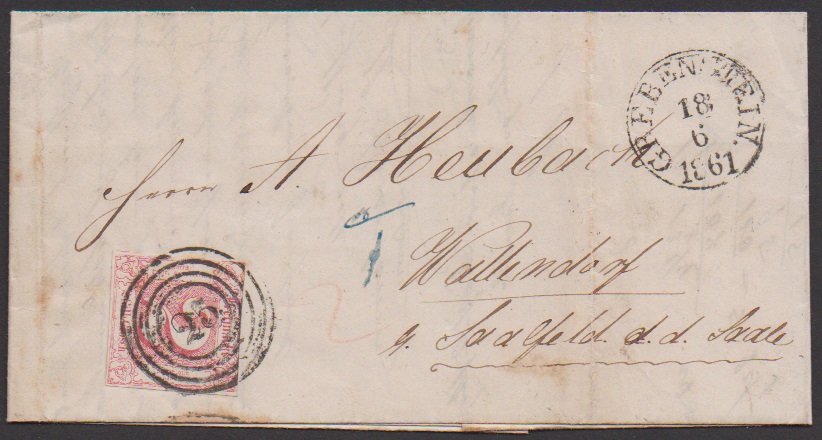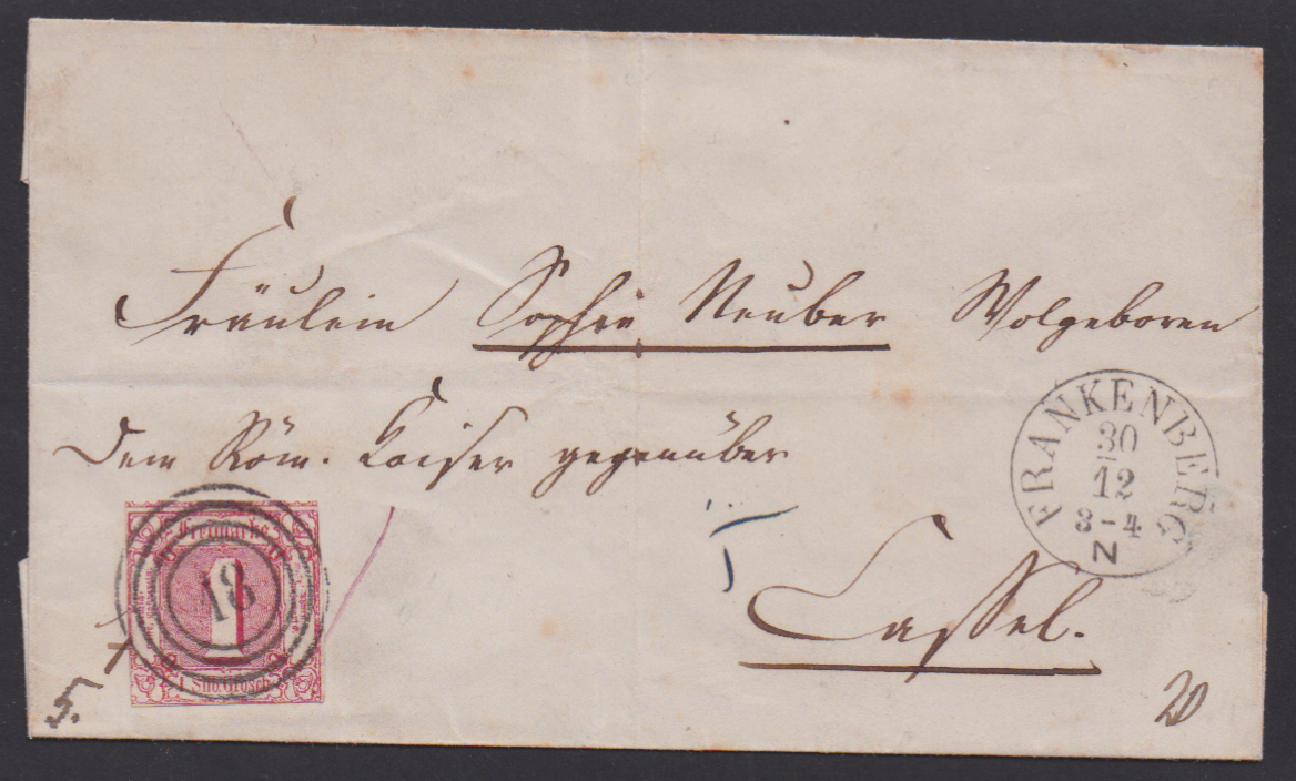 "18" nebst K1 "Frankenberg" sehr klar auf gef. Brief mit 1 Sgr.