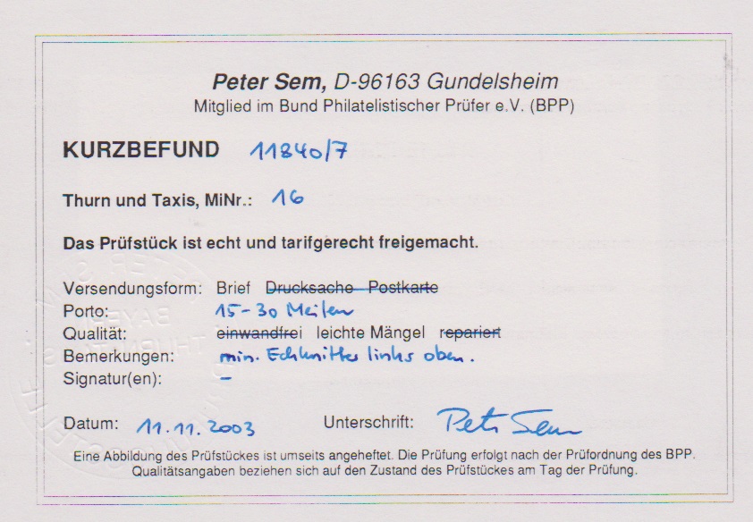 "11" nebst K1 "Breitenbach", je auf zwei Briefchen 1 Sgr. (einmal Scherentrennung), sowie auf losen 1/4 und 1 Sgr. (diese sign. Sem)