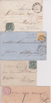 "104" (Typen) auf vier Briefen, Neben-K1 bzw. -K2 "Darmstadt": zwei Briefe je mit Einzelfrankaturen 1 Kr. nach Bessungen, Brief 9 Kr. (Mi.-Nr. 23), sowie überrandiges Kabinettstück 3 Kr.