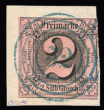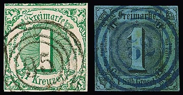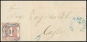 "52" (Niederaula) in blau klar auf gut gerandeter 1 Sgr., dazu "95" (Bensheim) in schwarz auf überrandigem Luxusstück 1 Kr.