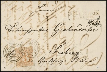 "67" zweimal, der Postablage-Ra2 "Schwarzenfels-Sterbfritz" sowohl zusätzlich zart auf der Marke als auch nebengesetzt, auf Brief 3 Sgr. (bereits mit Bug aufgeklebt)