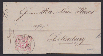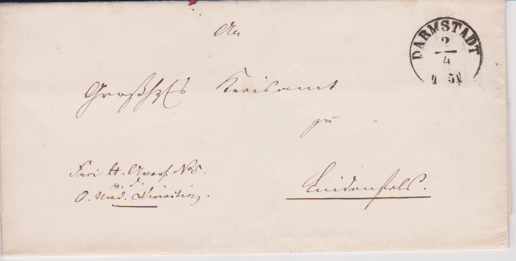 "Darmstadt", K1 (1868) und sehr früher hs. Vermerk "frei lt. Avers No. 5" auf sauberem Brief