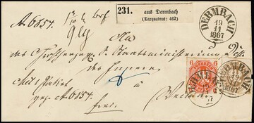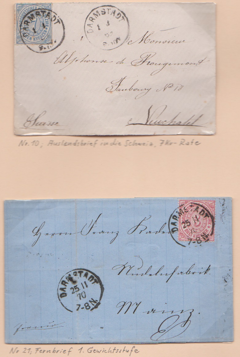 "Darmstadt", der neue Grotesk-K1 (Preußen) auf NDP: fünf Briefe, u.a. drei EF 7 Kr. (dabei in die Schweiz), Ortsbrief 1 Kr., sowie 18 lose Werte bzw. auf Briefstücken, dabei seltene Währungsfremdverwendung 1 Gr. (aber Mgl.) etc.