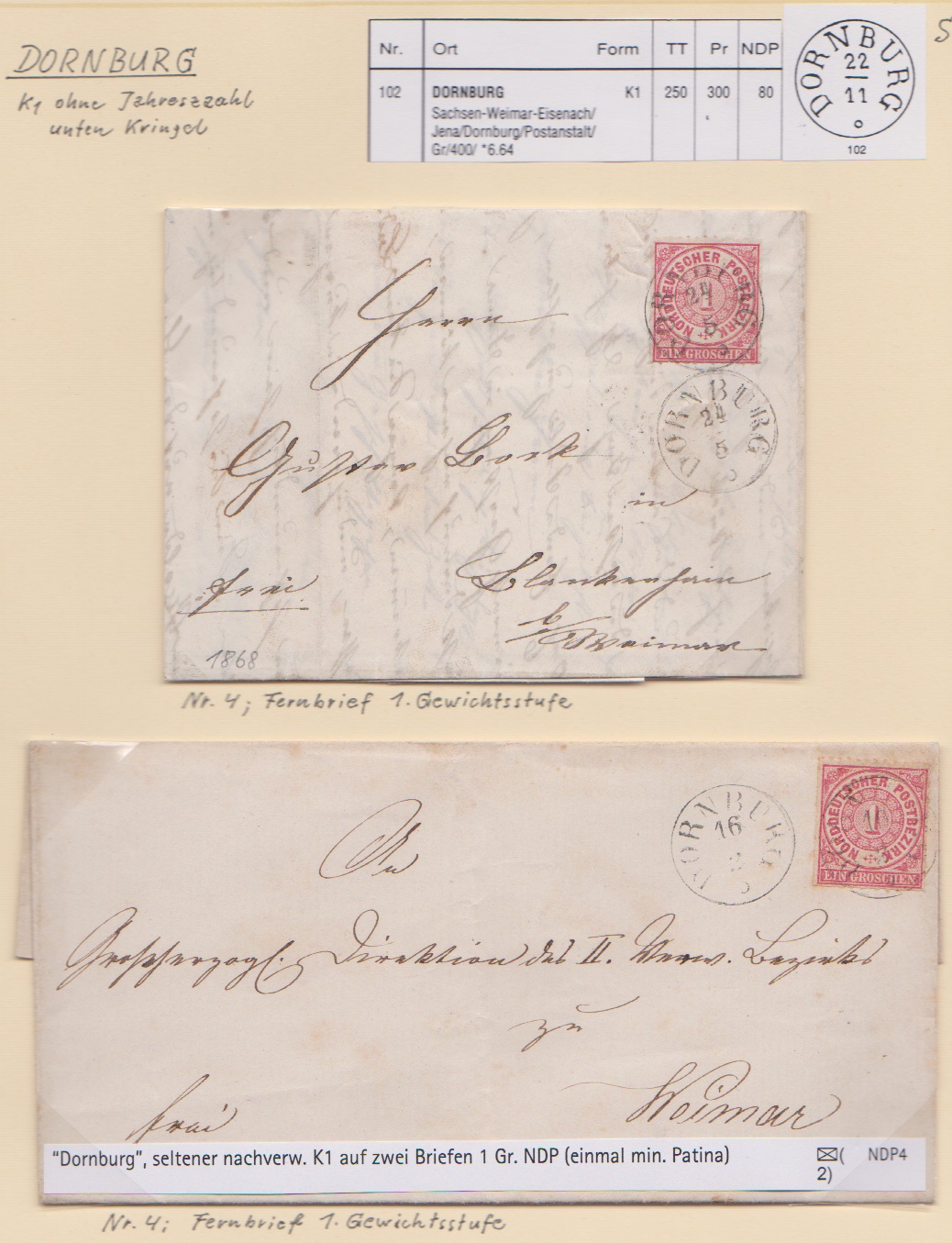 "Dornburg", seltener nachverw. K1 auf zwei Briefen 1 Gr. NDP (einmal min. Patina)