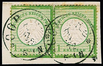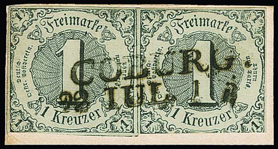 "Coburg", nachverw. K1 klar auf Briefstück mit Unterrandpaar 1 Kr. kl. Brustschild, sign. Krug