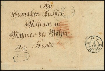 "Eisfeld", 1851/52, K1 nebst seltenem Privatpost-Ra1 "C.M.E." (C. Mevius Erben) auf Brief nach Gotha, dazu Brief aus Neuwied, jetzt mit Staatspost, aus gleicher Korrespondenz nach Gotha
