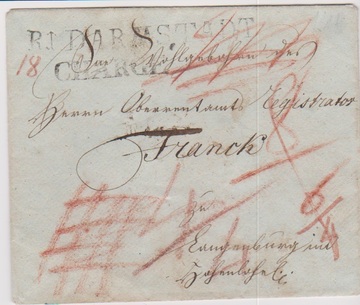 "Darmstadt", (1800), L1 "R.1. DARMSTADT" auf "Chargé"-Couvert nach Hohenlohe