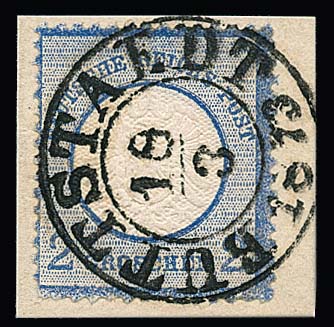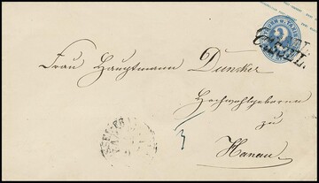 "Cassel", doppelter Bahnhofs-L1 auf Wertstempel von Ganzsache 2 Sgr. ultramarin, Bahnpost-K1 nebengesetzt
