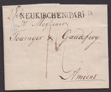 "Detmold", 1812, L1 und seltener Transit-L1 "Neukirchen (Par)" auf Auslandsbrief nach Amiens