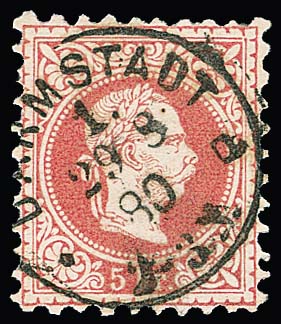 "Darmstadt 1a", neuer Postamts-Nummern-K1 als seltene Fremdentwertung auf Kabinettstück Österreich 5 Kr. rosa, Franz-Joseph, 1880. Fotoexp. Ferchenbauer