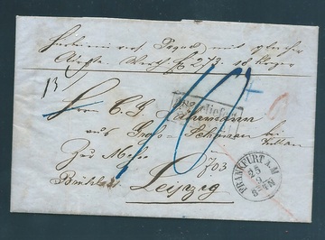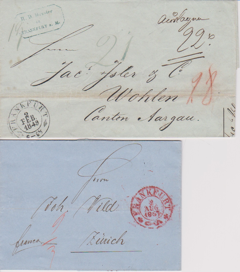 "Frankfurt", schwarzer K2 1849 (hs. "Auslagen 22 X") und roter K2 1857, auf zwei Briefen in die Schweiz