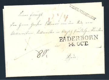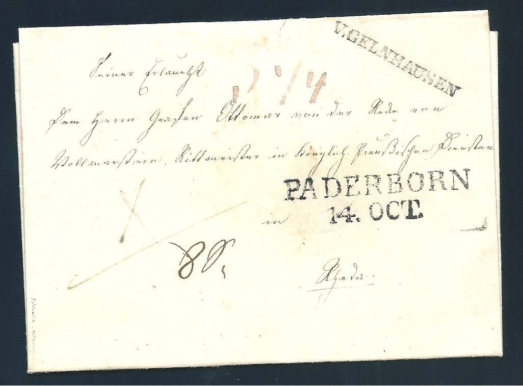 "Gelnhausen", (1822), spät verwendeter L1 "V. GELNHAUSEN" in Verbindung mit Transit-L2 "Paderborn" auf Briefhülle nach Rheda