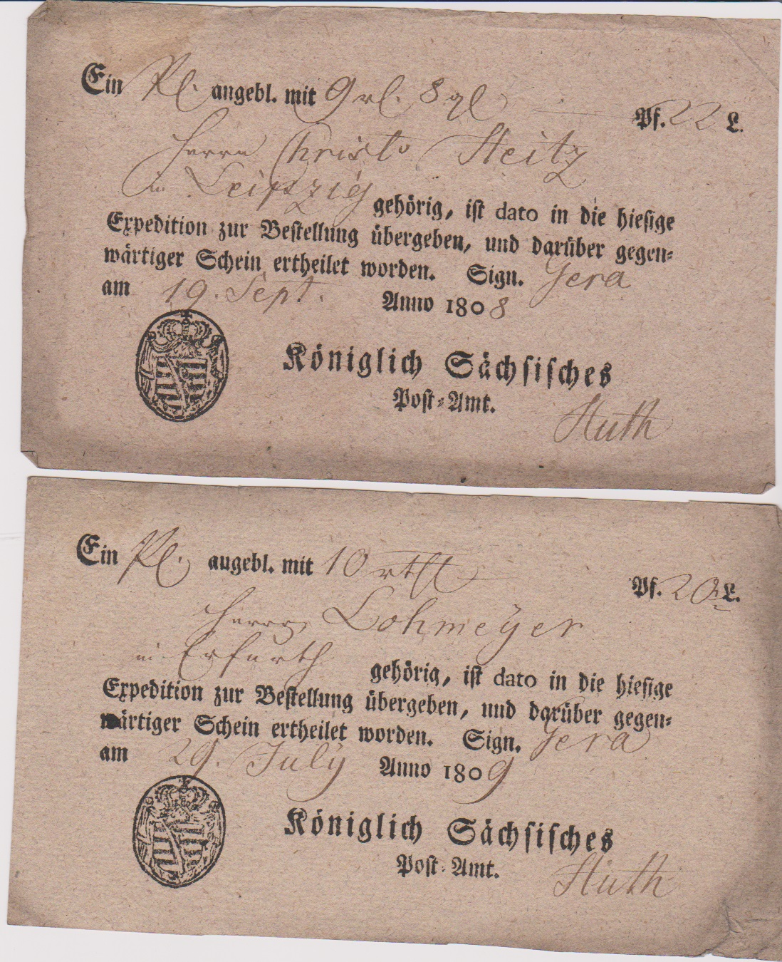 "Gera", 1808, fünf Postscheine "königlich Sächsisches Post-Amt"