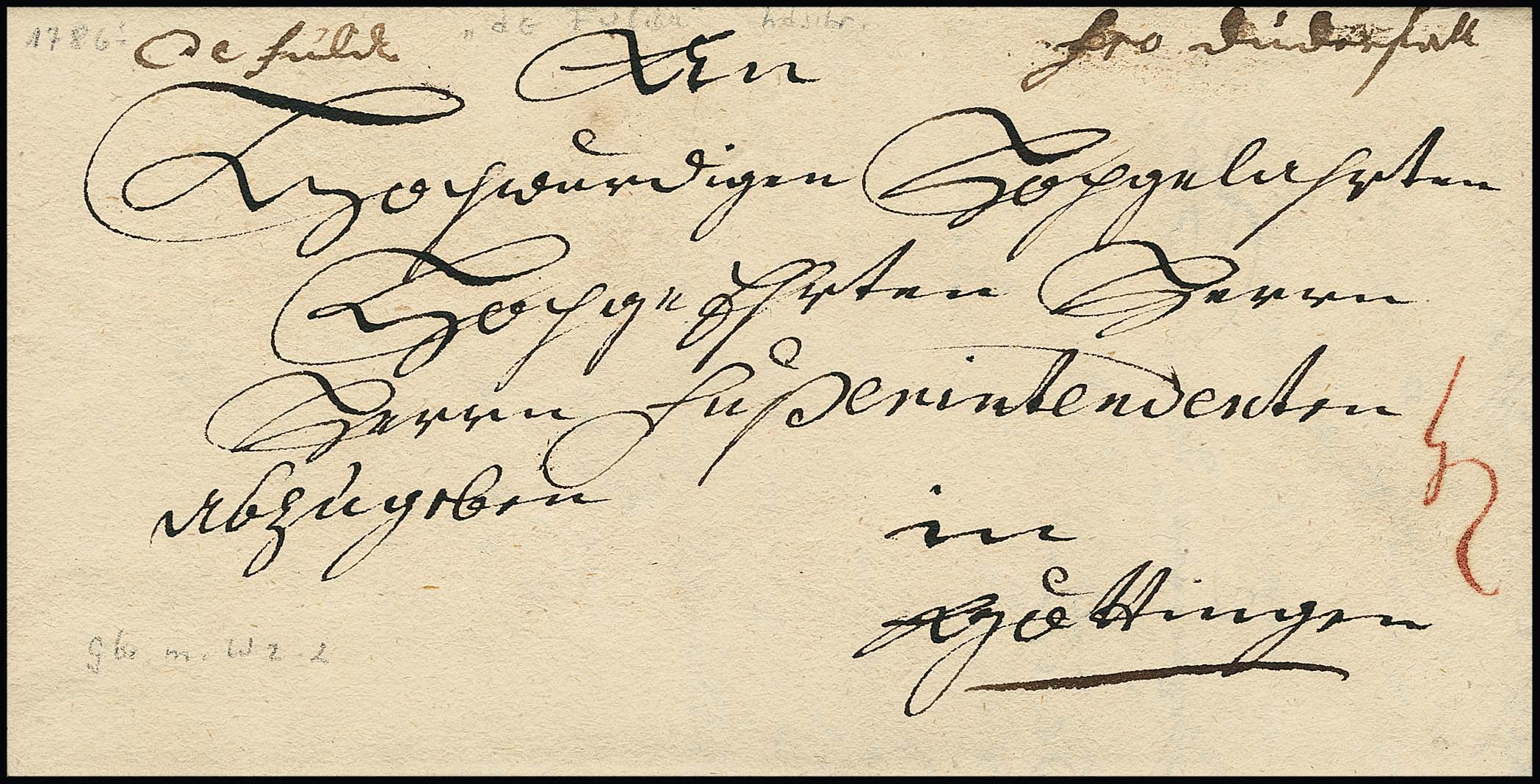 "Fulda", 1786, frühe hs. Aufgabe "de fulda", nebst hs. "fro. Duderstadt", auf Brief mit Inhalt nach Göttingen