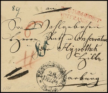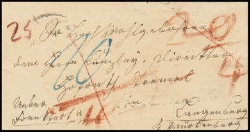 "Frankfurt", 1810/17, schwarzer bzw. roter K2, je nebst seltenem rotem L2 "RECOMMANDIRT VON FRANCFURT", auf zwei Chargébriefen nach Marburg bzw. Preßburg