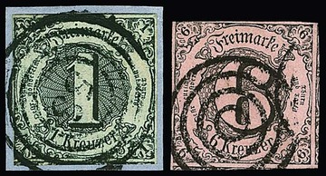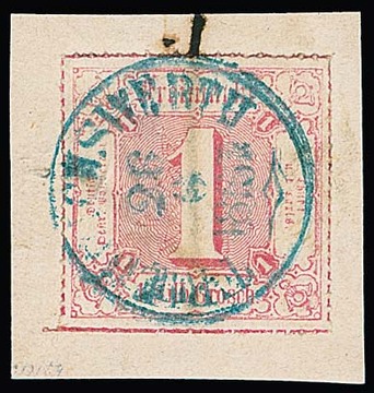 "Frankfurt a.M.", der seltene Versuchs-NS "53" klar auf Briefstück 1 Kr. schw./grün (in der Durchsicht gering hell, Fotoexp. Sem), sowie der Vierring-Versuchsstempel auf 6 Kr. schw./rosa