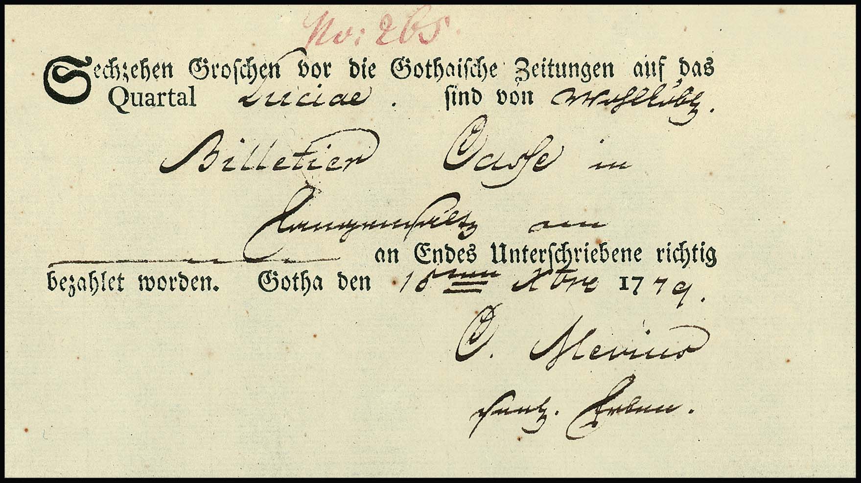 "Gotha", 1779, seltener früher Ortsdruck-Zeitungsschein "C. Mevius Erben"