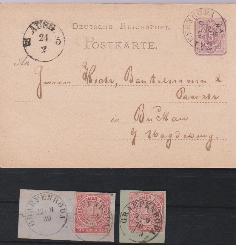 "Graefenroda", nachverw. K1 auf zwei Briefstücken 1 Gr. NDP und auf 5 Pfg.-Karte