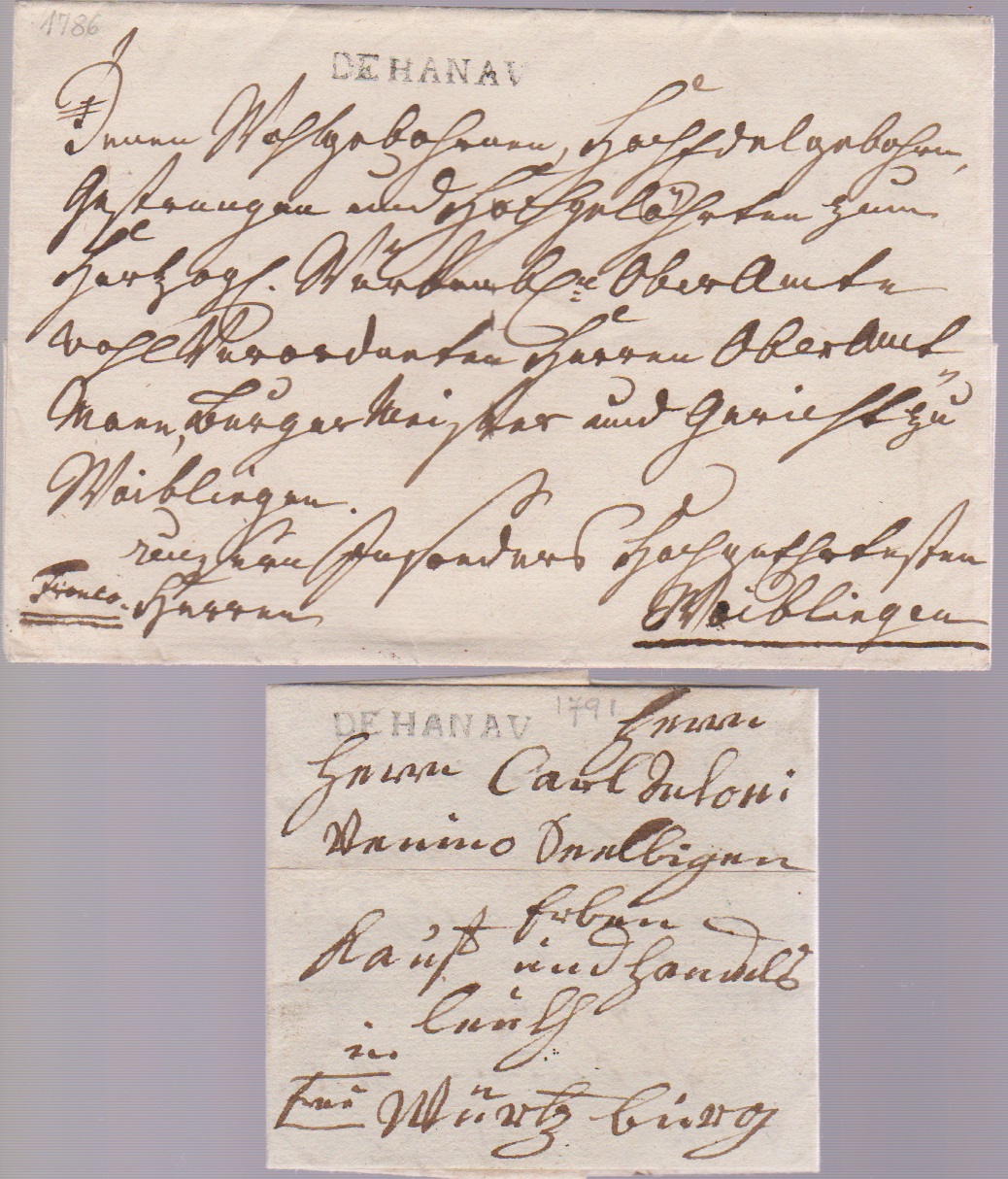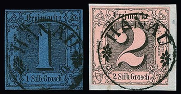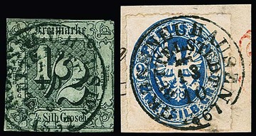 "Hanau", Zier-K1 ohne Datum als Entwertung, der große K2 (aus dem Ausgabemonat, 21.1.52) nebengesetzt, auf Brief 3 Sgr. (Bugspur), sowie auf erste Ausgabe 1 und zweimal 2 Sgr. (ein Bfst.)