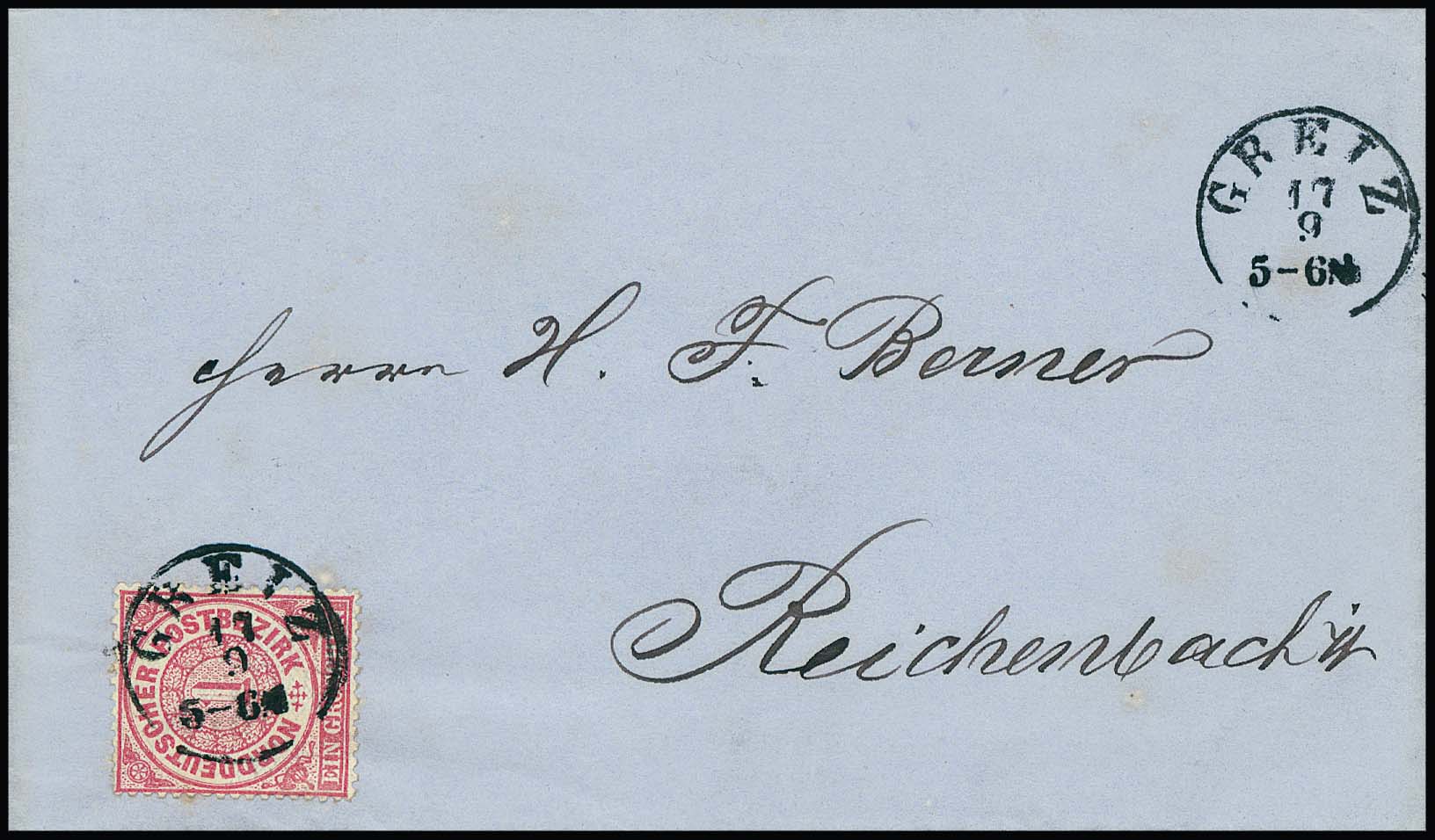 "Greiz", nachverw. kleiner K1 klar auf drei Briefen NDP aus gleicher Korrespondenz nach Reichenbach: 1 Gr., dreimal 1/3 Gr. (ungewöhnlich) sowie Reco mit 1 und 2 Gr., letztere kurze Zähnchen