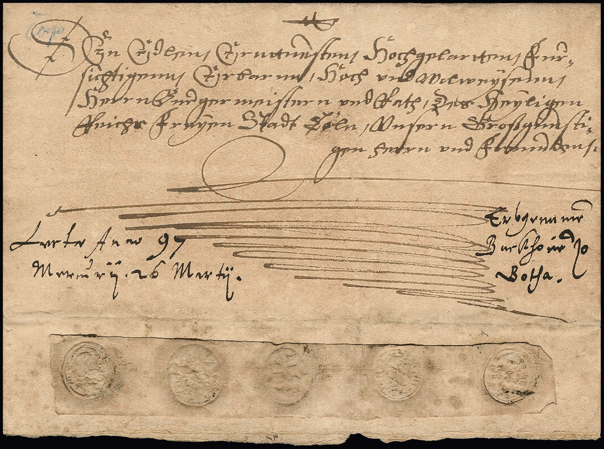"Gotha", 1597, sehr früher Schnörkelbrief mit eigener Unterschrift von Johann Bachofen von Echt (1543-1607), an die Stadt Köln (mit der Bitte um geringere Besteuerung), mit rs. fünffachem Siegel