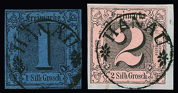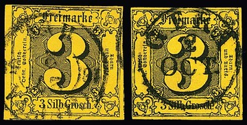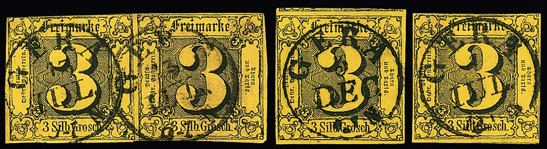 "Gera", je K1 (versch. Typen) auf zwei Kabinett-/Luxusstücken 3 Sgr., erste Ausgabe, einmal vom Rand mit Nebenmarke, je Fotoexp. Gärtner