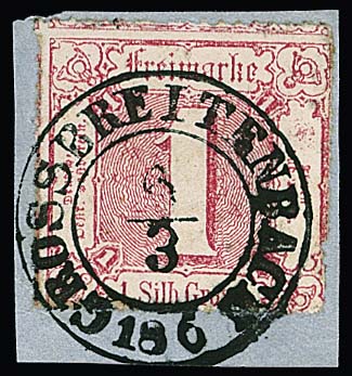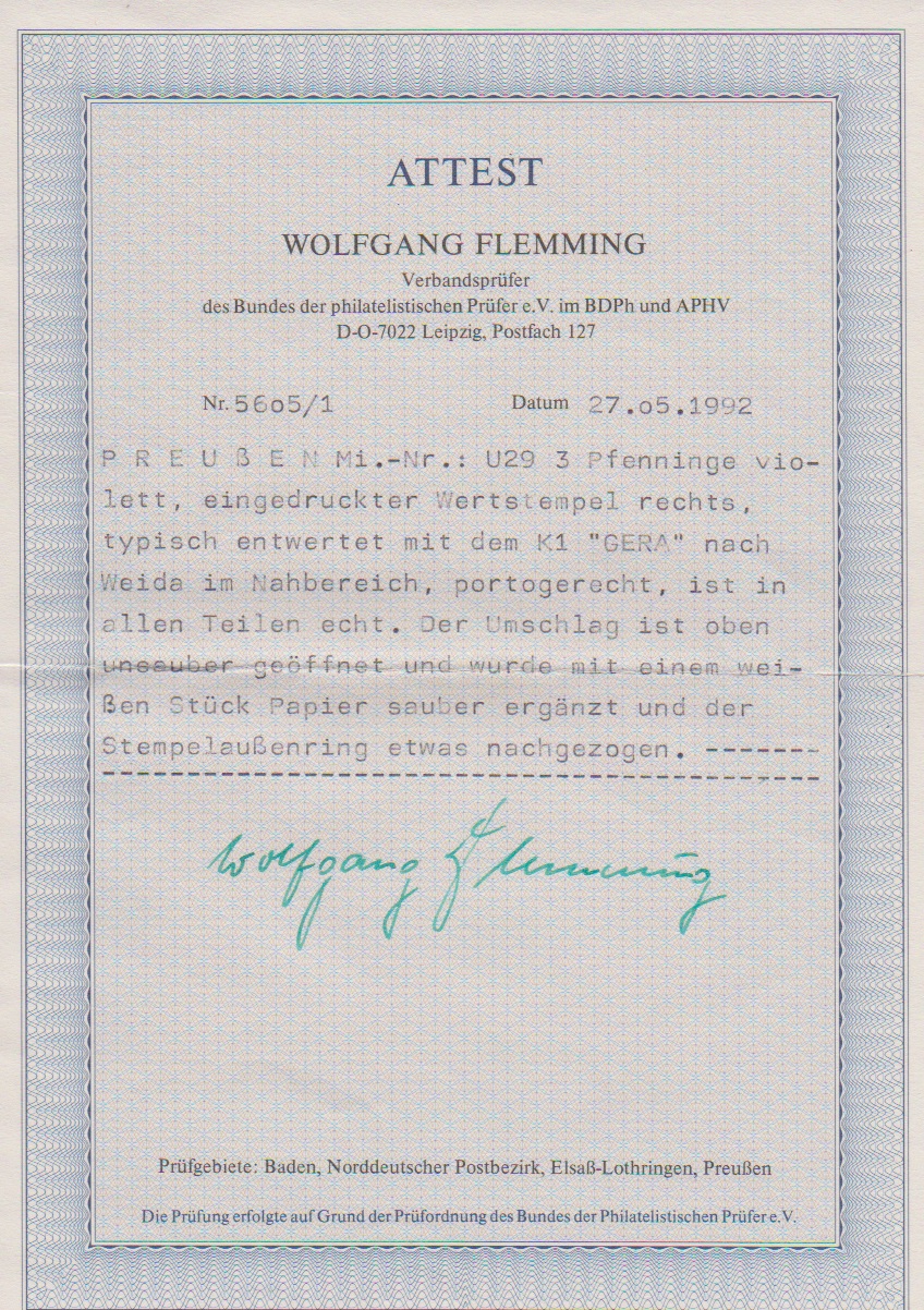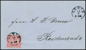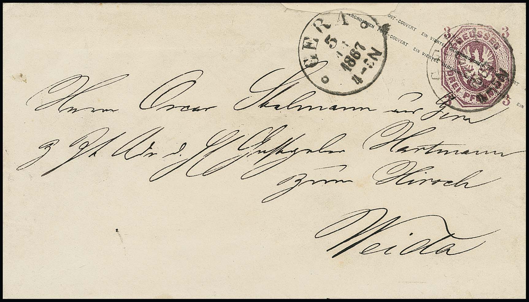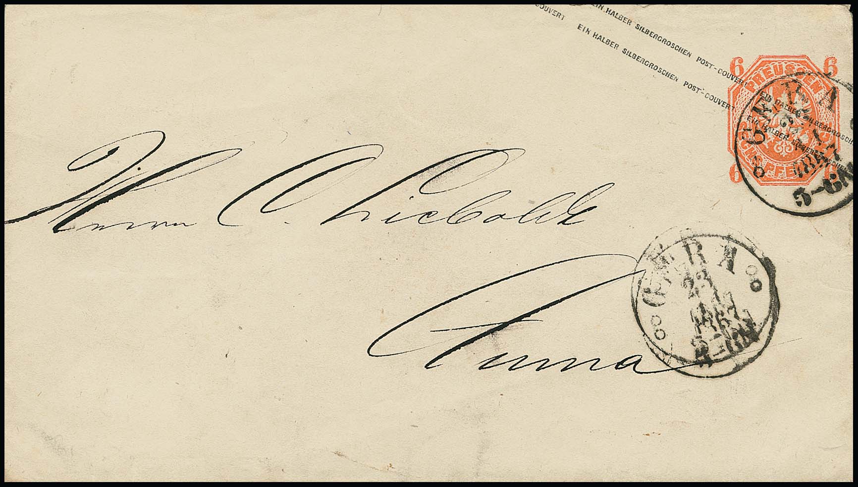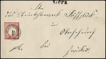 "Gera", nachverw. K1 v. 25.7.67 klar auf Preußen-Ganzsache 1 Sgr. und auf drei versch. Ganzsachen für das ehemalige Taxis-Gebiet: auf seltenem Couvert 3 Pfge. (kl. Fehlstelle) im Nahbereich nach Weida, Mi. 1900,-, Attest Flemming, auf Couvert 6 Pfge. nach Auma und auf Ganzsache 3 Sgr. Sehr seltene "Serie"