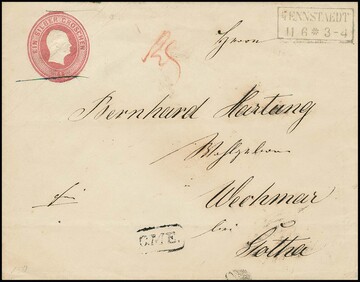 "Gotha", (1855), Preußen-Ganzsache 1 Sgr. rosa, erste Ausgabe, im Großformat, von Tennstaedt (Ra2) nach Wechmar bei Gotha, wobei die Beförderung in den Landbezirk ab Gotha über die Privatpost C. Mevius Erben, gemäß des vorderseitigen Ra1 "C.M.E.", erfolgte. Wir haben jeweils von Sachsen und Hannover einen Beleg mit der Weiterbeförderung über die Privatpost Mevius Erben registriert, von Preußen ist es das erste bekannte Stück. Die Gebühren für die Weiterbeförderung vs. in Rötel notiert
