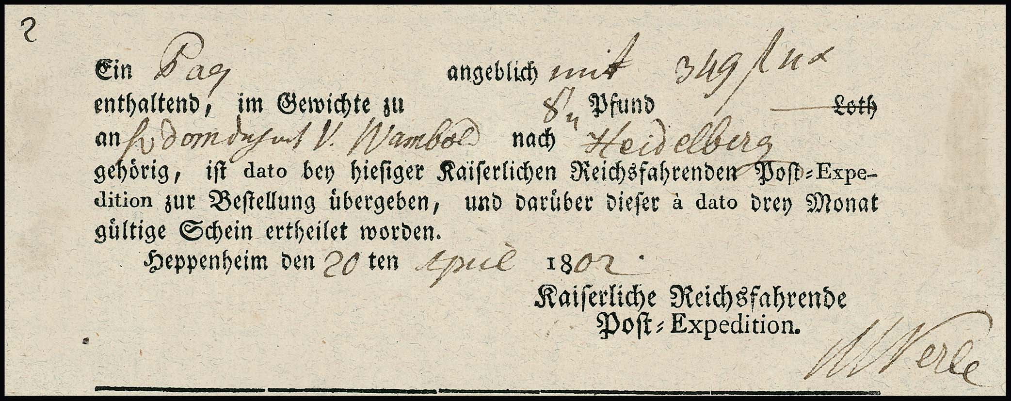 "Heppenheim", 1802, Ortsdruck-Reichspostschein "kaiserliche Reichsfahrende Post-Expedition" über ein Wertpaket