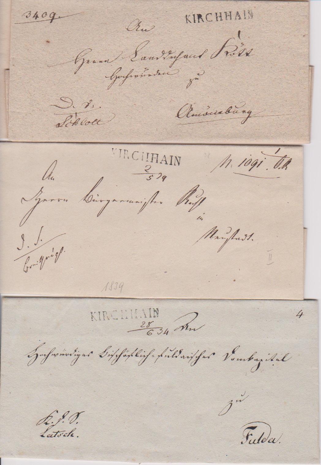 "Kirchhain", ab ca. 1830, zwölf Briefe mit vorphil. L1 (teils mit hs. hinzugesetztem Datum), sowie ein Wertbrief (1810) mit hs. Aufgabe "v. Kirchhain"