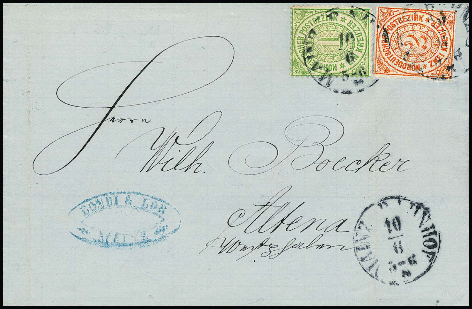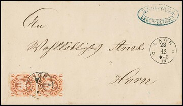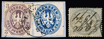 "Lage", nachverw. K1 auf Brief mit Paar Preußen 6 Pfge., ferner auf fünf NDP-Belegen (dabei seltenes Randpaar 1 Gr., ein Wert Einriß, sowie Dienst 1 Gr. EF), sowie neun Brustschild-Belege, dabei Unterrandstück 1 Gr., gesamt 15 Belege