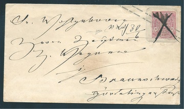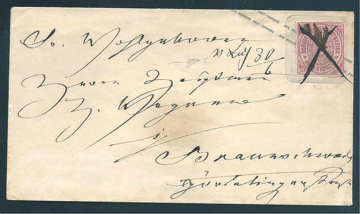"Mainz Bahnhof", nachverw. K1 auf Brief mit Mischfrankatur NDP 2 Kr. orange, durchstochen, und 1 Kr. grün, gezähnt. Zwischen den Marken leichte Brieffalte