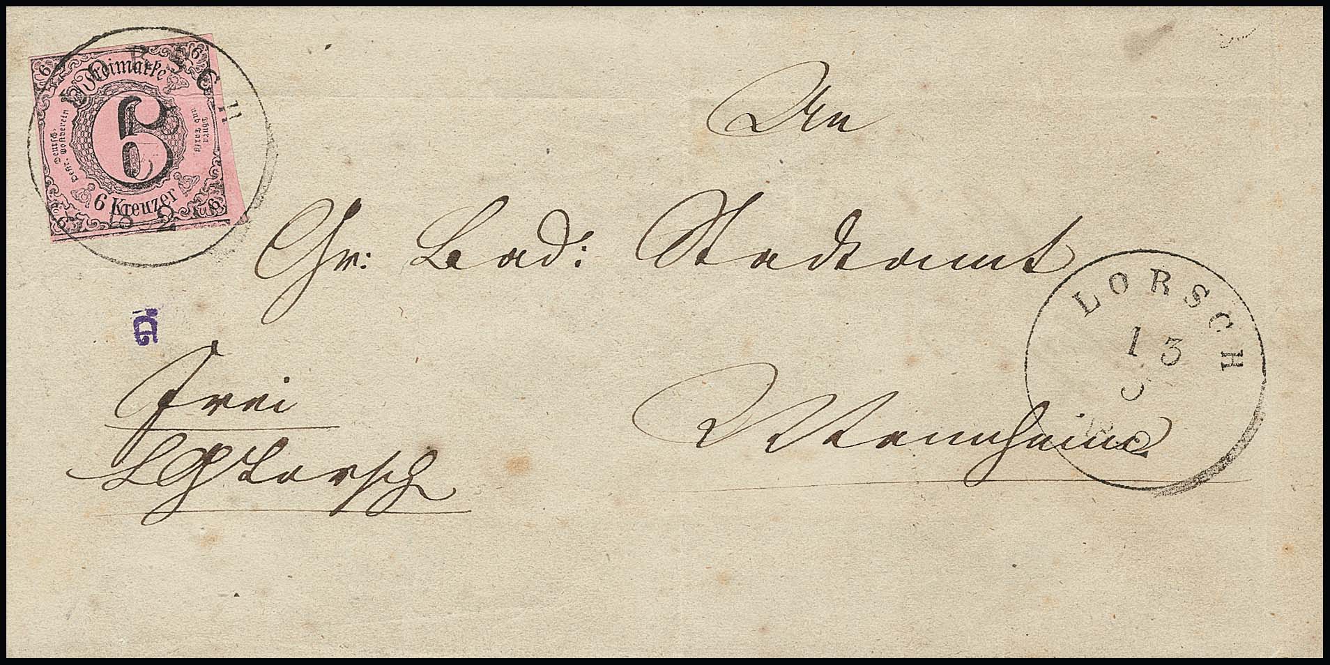 "Lorsch", klar zentrischer K1 (v. 13.5.52) auf Faltbrief mit rechtem Randstück 6 Kr. schw./dunkelrosa (Bugspur), erste Ausgabe