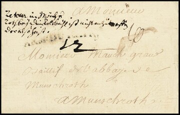 "Hochheim bei Worms", 1745, 20.7., Prachtbrief mit schwachem L1 "Arm. Du Rhin" nach Mönchsroth (bei Biberach), Absendervermerk "Au camp d` Orscheim", hs. "Retour in Mönchsroth bey Dinckelsbühl ist nicht anzutreffen, der also heist"