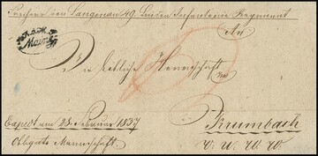 "Mainz K.K.Ö.M.P.", 1837, Ovalstempel der österreichischen Truppen in der Bundesfestung auf Faltbrief mit Inhalt nach Krumbach
