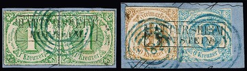 "Hattersheim-Eppstein" und "Hattersheim-Hofheim", je voller, seltener Postablage-Ra2 in schwarz nebst blauem NS "182" von Hattersheim auf zwei Briefstücken, 6 Kr. hellblau nebst durchstochener 9 Kr., sowie letzte Ausgabe 1 Kr. per zwei (Briefstück ehemals getrennt)