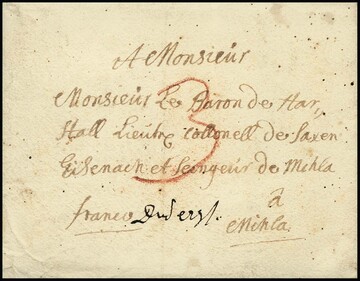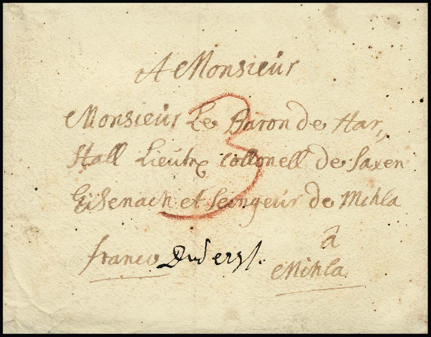 "Mainz", 1752, interessanter Brief mit Militäradresse "p. Eisenach, franco, cito, cit." nach Mihla/Thüringen, hs. "fco. Eisenach", dazu weiterer Brief aus 1755 aus gleicher Korrespondenz
