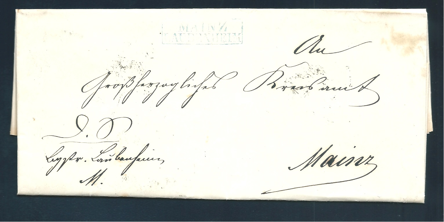 "Mainz-Laubenheim", blauer Postablage-Ra2 als alleiniger Aufgabestempel auf Brief 1864