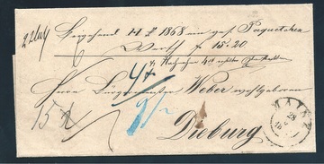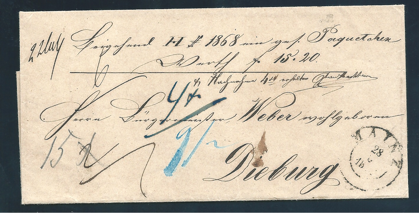 "Mainz", (1860), K2 und rs. großer Paketzettel im Ortsdruck auf Paketbrief (unterfrankiert und nachtaxiert)
