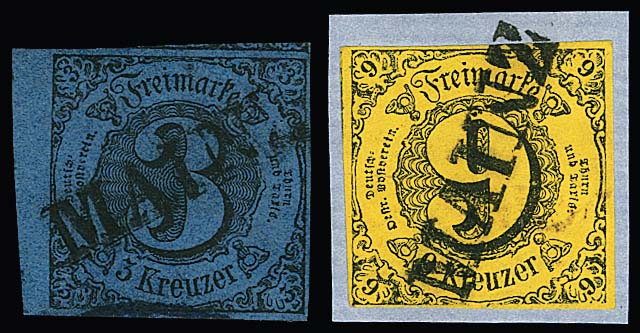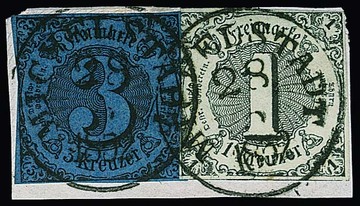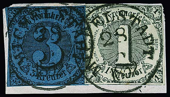 "Michelstadt", Orts-K1 auf Briefstück erste Ausgabe mit gut geschnittenen 1 und 3 Kr., sowie auf loser 3 Kr. (kl. Mgl.), früh am 25.1.1852
