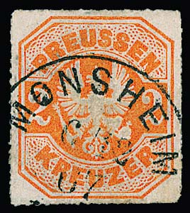 "Monsheim", seltener, erst spät in 1867 eingeführter neuer preußischer Grotesk-K1 klar auf Preußen 2 Kr. (Hb. 600 P.)
