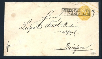 "Nieder-Ingelheim/Gau-Algesheim", Postablage-Ra2 als alleinige Entwertung auf Ganzsache 2 Kr. gelb (verklebte Öffnungsmgl.)