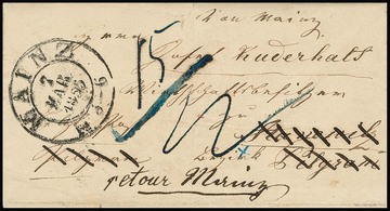 "Mainz", 1855, K2 auf interessantem Retour- und Nachsendebriefchen nach Österreich (Pilgram), hs. "retour Mering", versch. Taxen