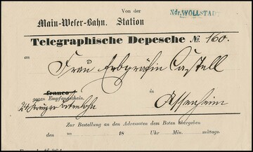 "Niederwöllstadt", 1873, vollständiges Telegramm der Main-Weser-Eisenbahnstation, Vordruckcouvert nebst zugehörigem Telegramm an die Erbgräfin von Castell in Assenheim, hs. "24 Kreuzer Botenlohn"