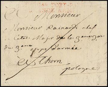 "Mainz", 1807, seltener Brief an einen Angehörigen der Grande Armee mit zartem rotem L2 "BAU GAL PORT PAYÉ GRANDE ARMEE" nach Thorn, Attest v.d. Linden