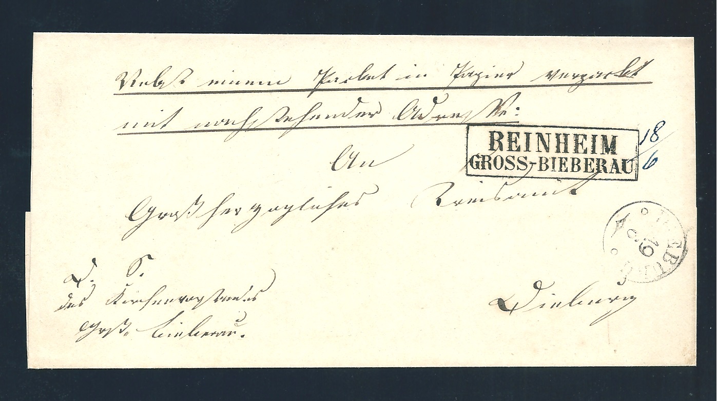 "Reinheim-Gross-Bieberau", Postablage-Ra2 klar auf Faltbrief (1865) nach Dieburg