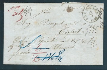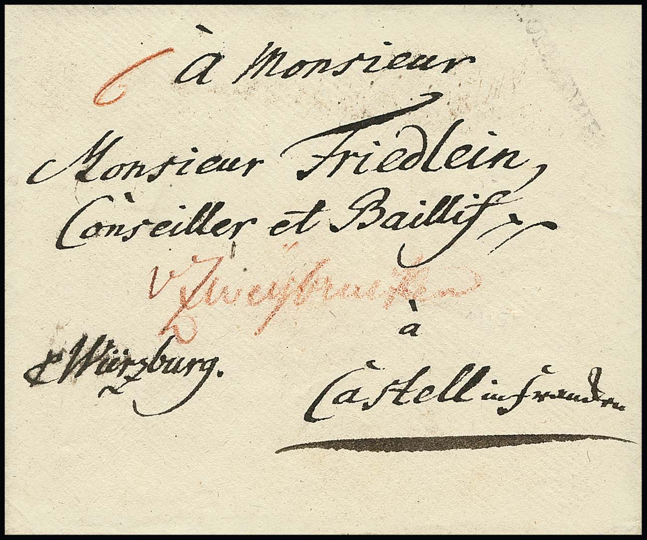 "Oppenheim", 1790, erster L1 "DE OPPENHEIM" auf Adelscouvert mit Inhalt nach Castell, versehentlich mit falschem Transit-Rötel "V. Zweybrücken" versehen